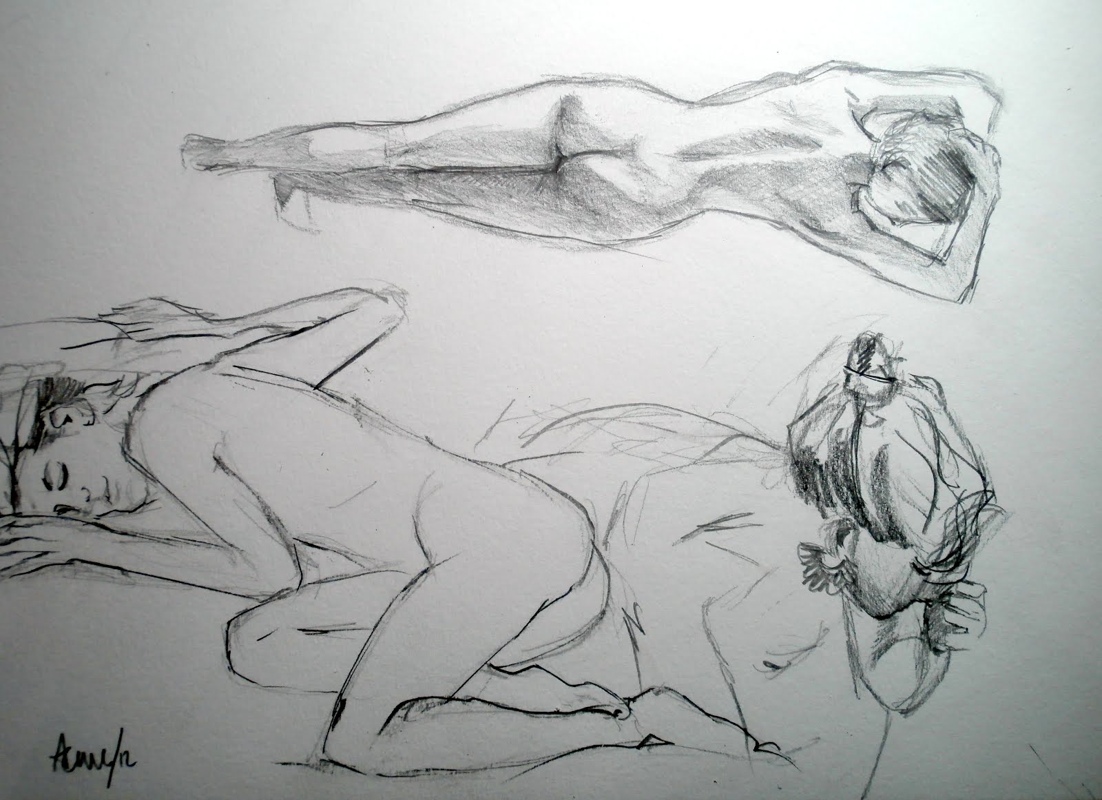 Another first for the Drawing Vault - gesture drawings - and very quick ones at that. I found this super website that displays photographs of models specifically for artists to draw or paint from and as I haven't painted in front of a live model for years, this was a super find. I decided to start doing very quick drawings from this website tonight and to my dismay I find I am completely out of practice. I could draw better at school. I guess I shouldn't put any old drawing on this blog, but right now I'm not bothered as I want to see how my skills progress if I manage to draw each night, time permitting. These were done with pencil - charcoal is too messy for this late hour - and with a bit of luck my photography of drawings and sketches should improve over time as well.